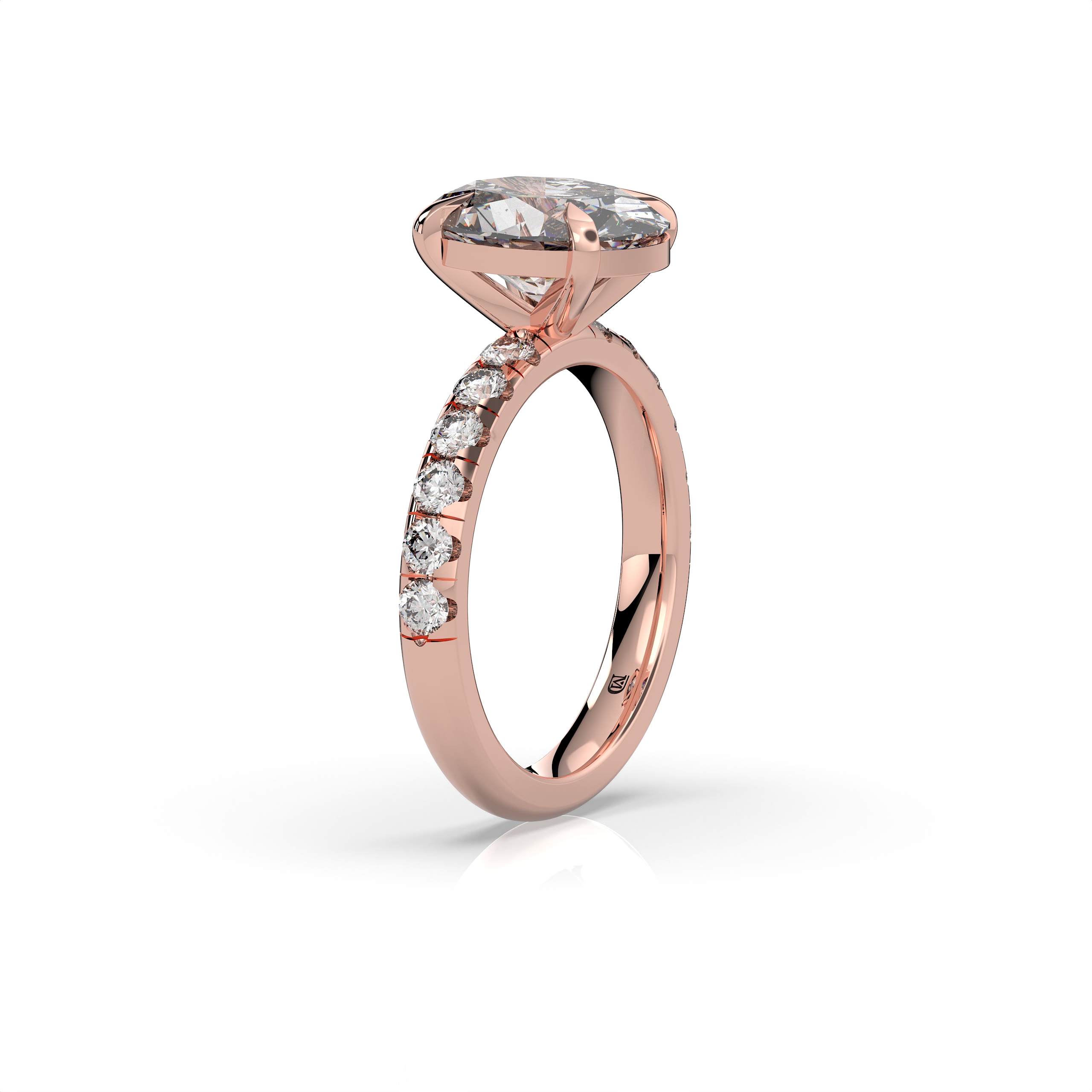 במרכז הטבעת משובץ יהלום מעבדה במשקל 2.5 קראט, בצבע E ובניקיון EVVS2, שילוב המבטיח מראה בהיר, נקי וקריסטלי עם נצנוץ מרהיב מכל זווית. לצידי האבן המרכזית משובצות 12 אבנים צדדיות במשקל כולל של 0.62 קראט, המוסיפות עומק, זוהר ואלגנטיות יוקרתית לעיצוב כולו.