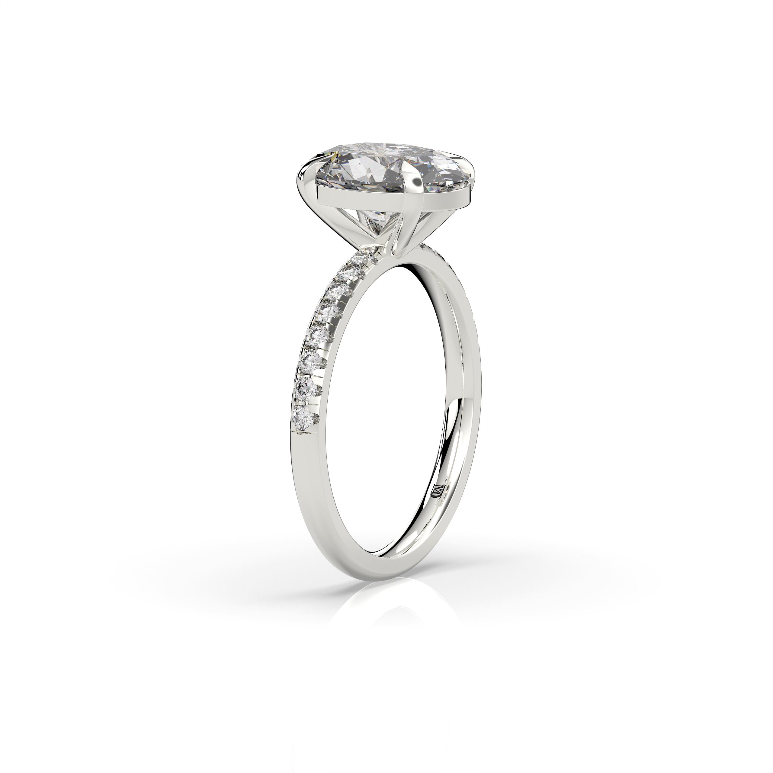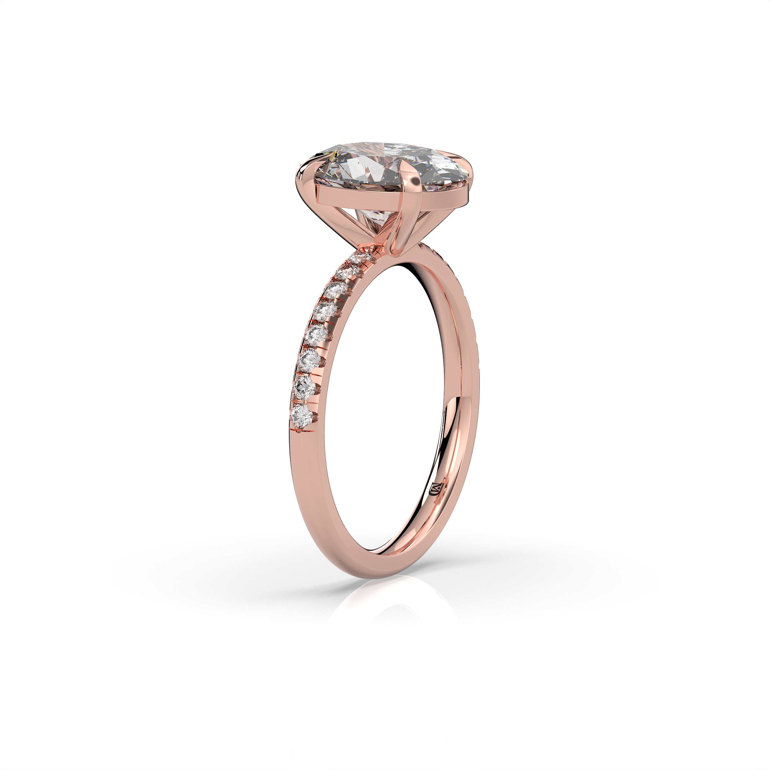 במרכז הטבעת משובץ יהלום מעבדה במשקל 3 קראט, בצבע E ובניקיון EVVS2, שילוב המבטיח מראה בהיר, נקי וקריסטלי עם נצנוץ מרהיב מכל זווית. לצידי האבן המרכזית משובצות 16 אבנים צדדיות במשקל כולל של 0.20 קראט, המוסיפות עומק, ברק ואלגנטיות יוקרתית לעיצוב הכולל.