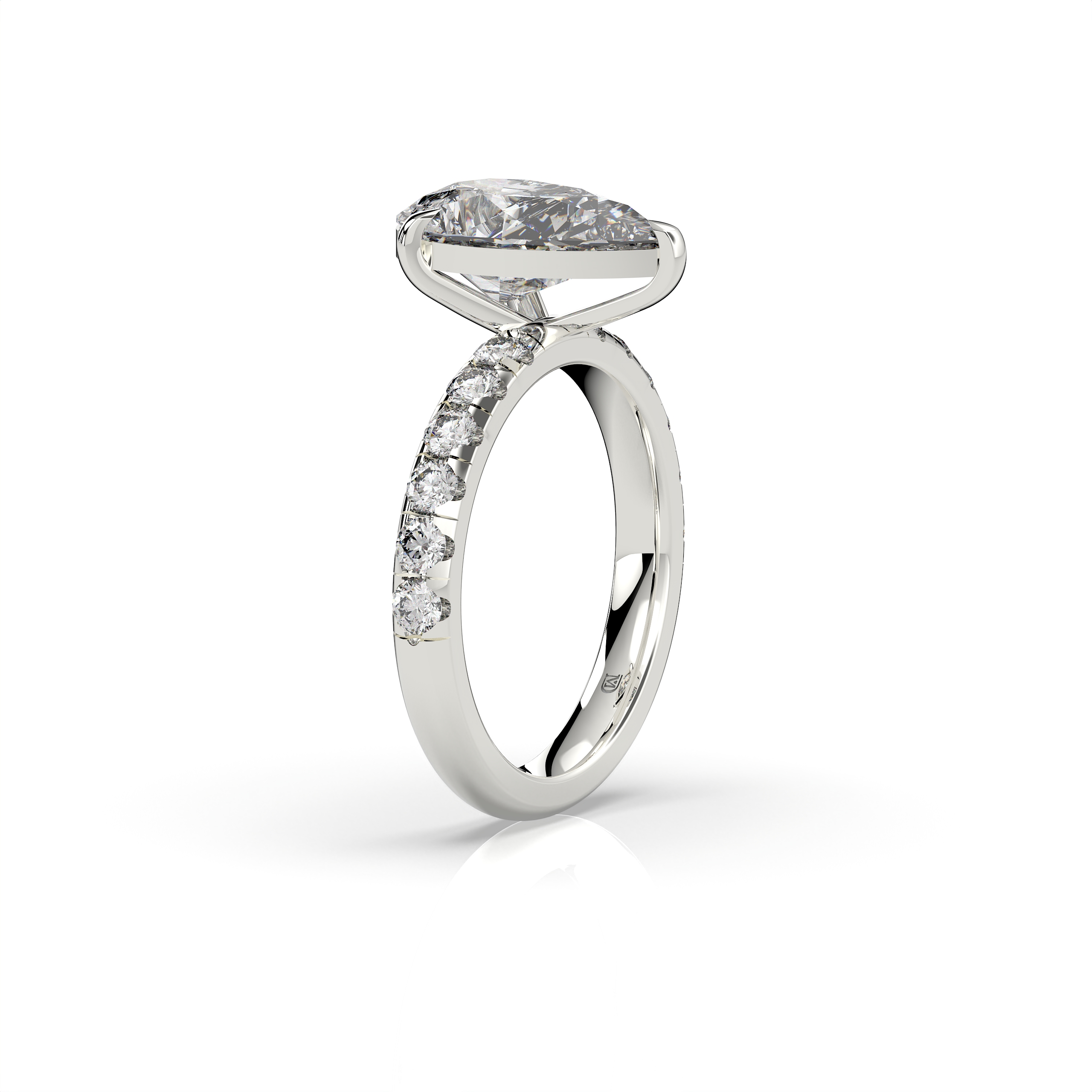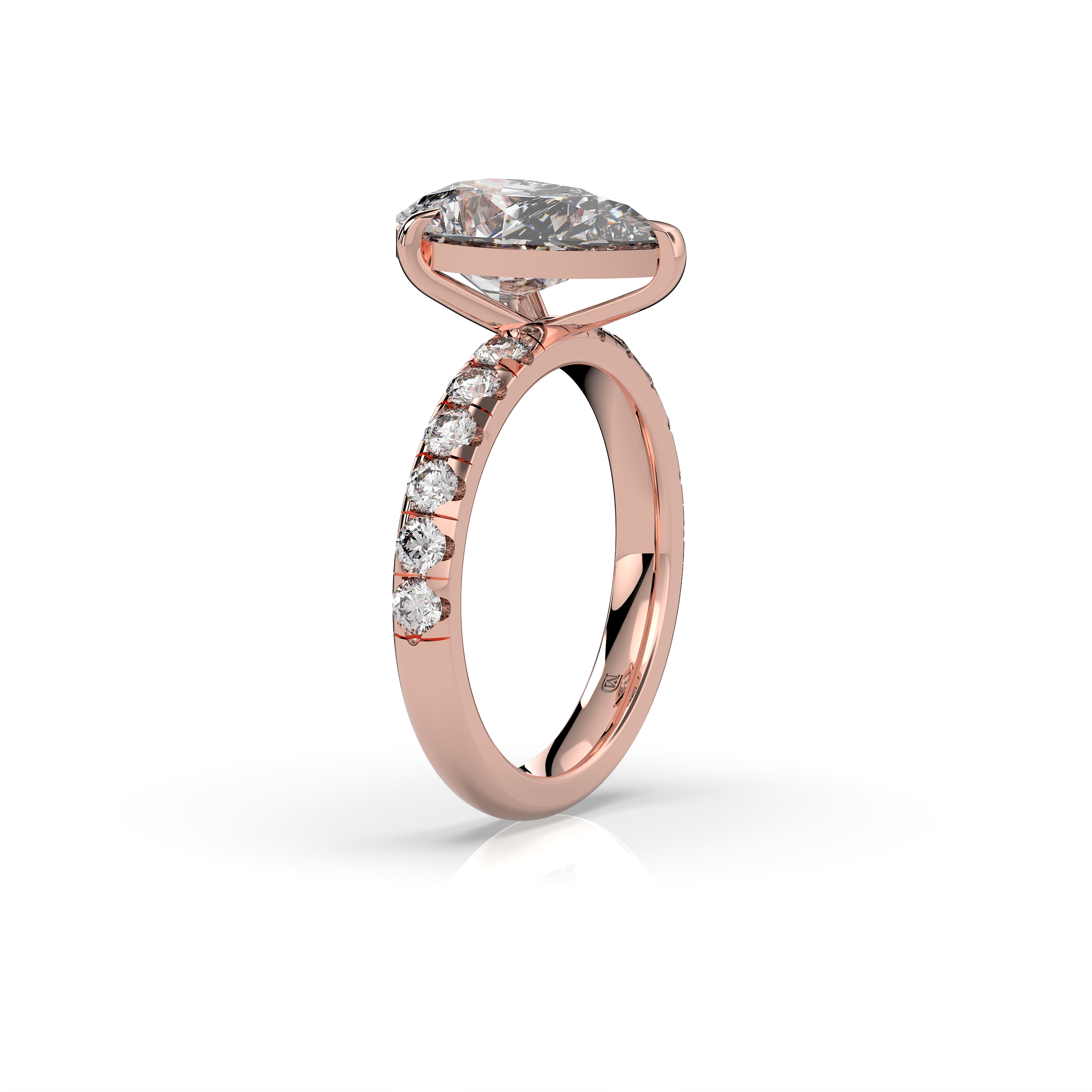 במרכז הטבעת משובץ יהלום מעבדה במשקל 3 קראט, בצבע E ובניקיון EVVS2, שילוב המעניק ליהלום מראה בהיר, נקי וקריסטלי עם נצנוץ עוצמתי מכל זווית. לצידי האבן המרכזית משובצות 12 אבנים צדדיות, המוסיפות עומק, ברק ונוכחות יוקרתית לעיצוב הכולל.