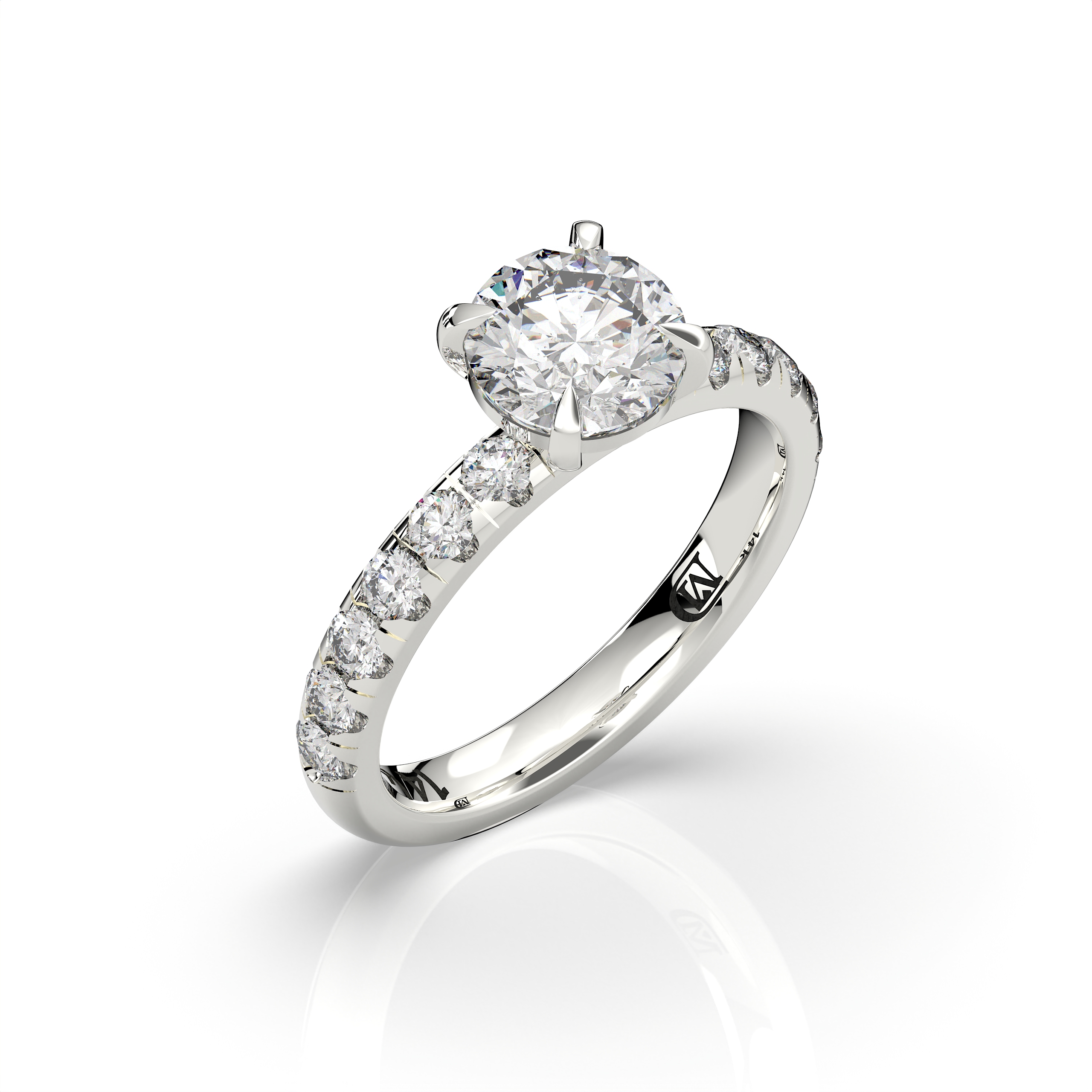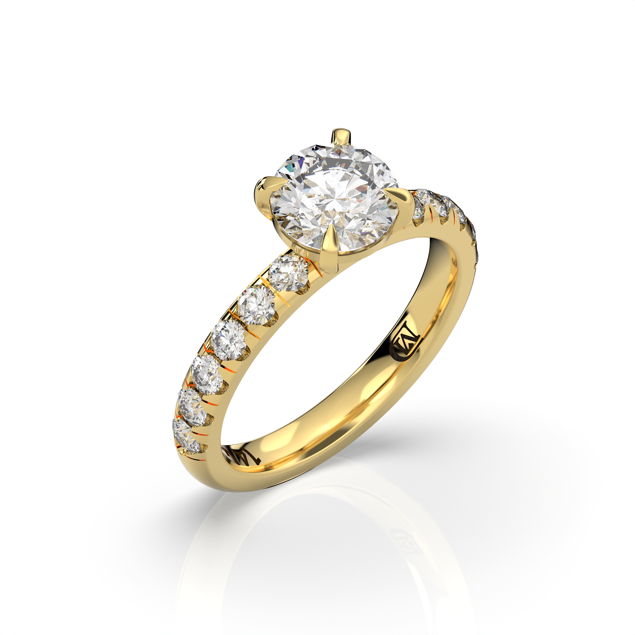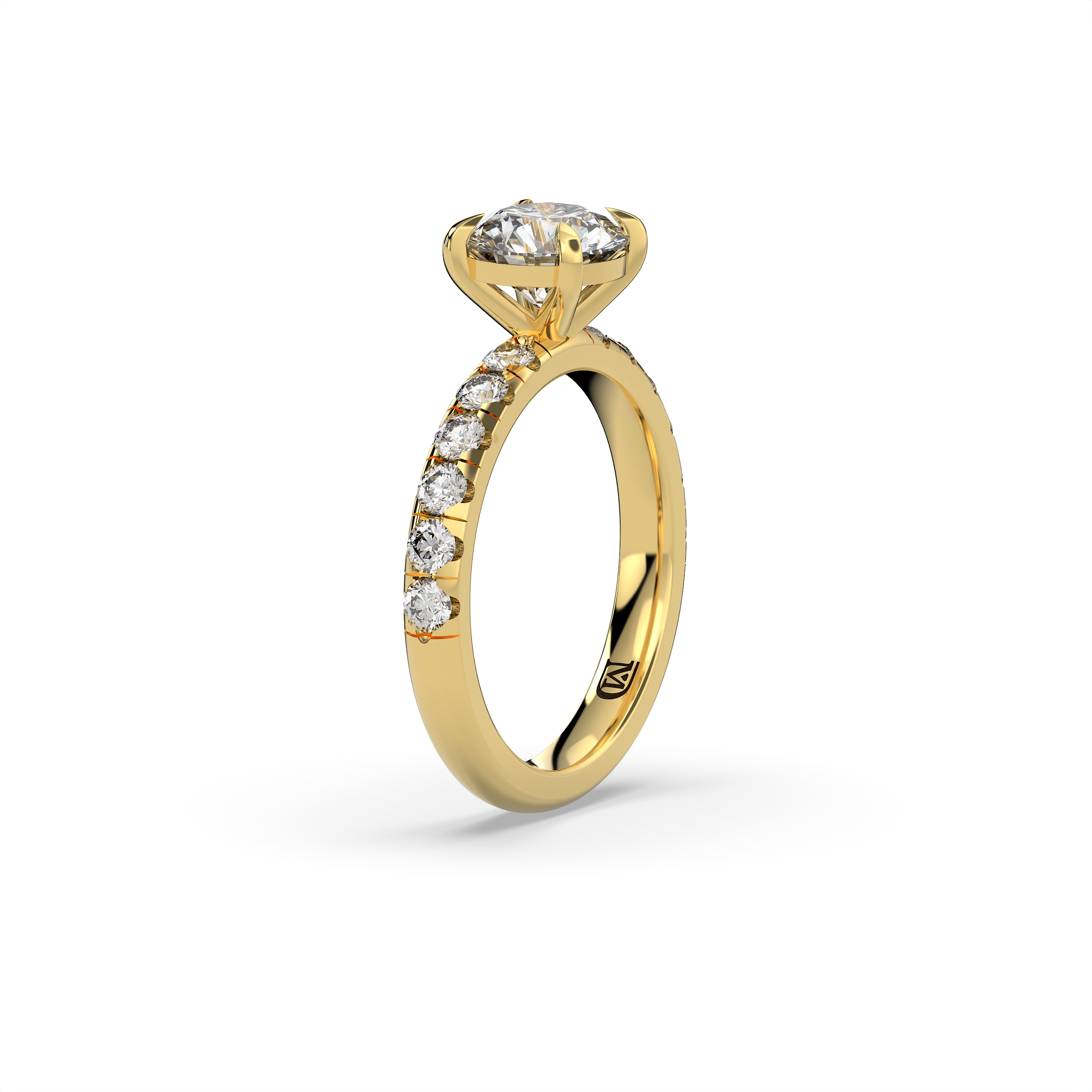 במרכז הטבעת משובץ יהלום מעבדה במשקל 1.5 קראט, בצבע E ובניקיון EVVS2, המעניקים ליהלום מראה בהיר, נקי ויוקרתי עם נצנוץ מרהיב מכל זווית. לצידי האבן המרכזית משובצות 12 אבנים צדדיות במשקל כולל של 0.62 קראט, המוסיפות לטבעת עומק, ברק ונוכחות אלגנטית במיוחד.