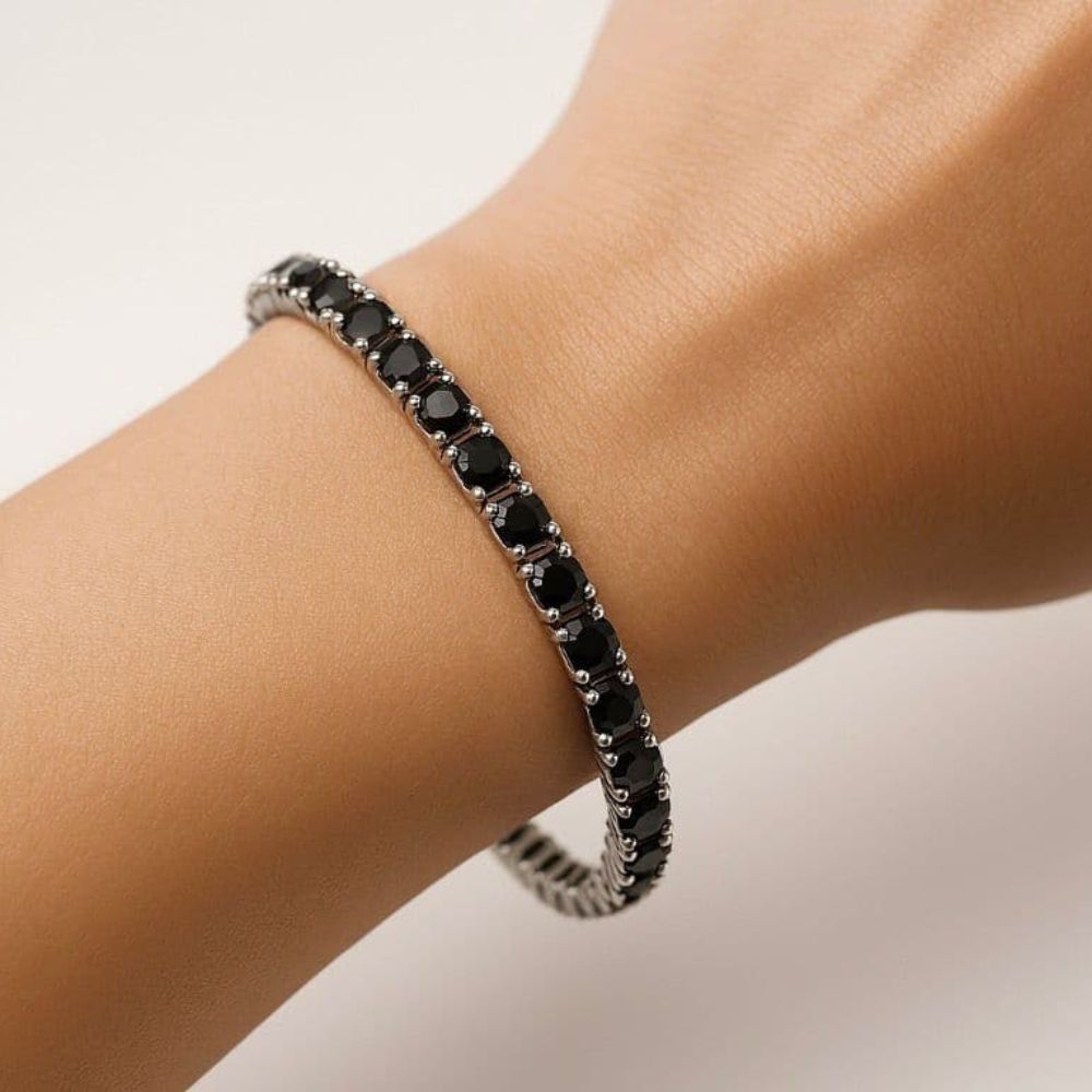 לאורך הצמיד משובצות אבנים שחורות טבעיות במשקל כולל של 15 קראט, בצבע שחור עמוק ובצורת עגול, היוצרות רצף אחיד ומרשים של ברק כהה ועוצמתי. האבנים השחורות מעניקות לצמיד מראה ייחודי, מודרני ויוקרתי, כזה שמושך תשומת לב ומשדר ביטחון וסטייל יוצא דופן.
